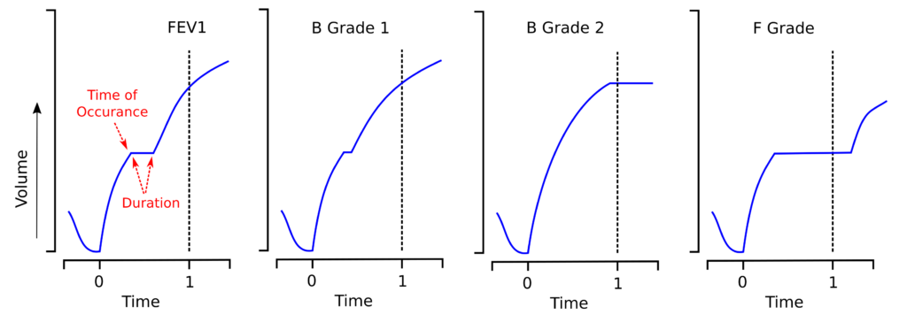 What matters is the duration of the pause within the FEV1. Any part of the pause that occurs after the FEV1 may possibly affect the FVC, but not the FEV1. A possible grading system would be: