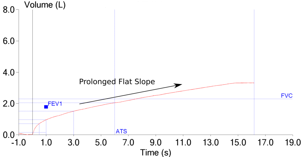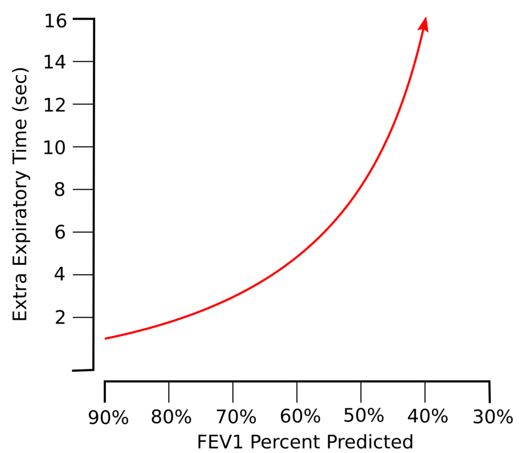 The degree of this curvilinearity is only speculative however, but expiratory time should be adjusted for obstruction in some way. Off the top of my head I’d suggest that anybody with mild airway obstruction needs an additional 25% in expiratory time for a reliable FVC and that anybody with very severe airway obstruction would need 3 times their expected expiratory time for a reliable FVC and in-between: