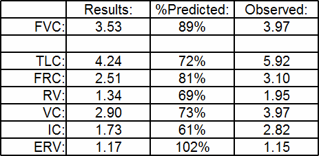 A simple solution would have been to manually enter a new SVC using the FVC volume and if this was done it would have bring the calculated TLC to 4.87 liters and 82% of predicted (the reason it’s not 4.97 liters has to do with the difference in the assumed ERV). The problem with doing this is that ERV and IC do matter and that this would mix the ERV from one test with the VC from another. This is the same reason I believe that using linked maneuvers (the FRC and SVC from the same test) is much more accurate than measuring FRC and SVC separately and combining the “best” results.