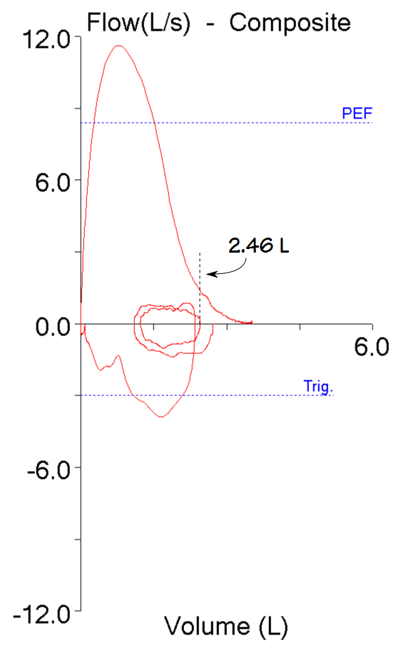 Next I reviewed the patient’s FVC tests and found that there was a lot of variability in FVC, FEV1 and the flow-volume loops. The reported test however, was the best of all the tests the patient had performed both in terms of volume and quality. The FVC test module does not calculate IC or ERV (and in fact I don’t know of any FVC test module that does) but when I looked at the position of the tidal loop within the overall flow-volume loop, it looked like the IC was larger than the one reported from the SVC. In order to confirm this, I transferred the flow-volume loop to a graphics program that has a ruler function and I was able to measure the IC from the FVC as being 2.46 liters.