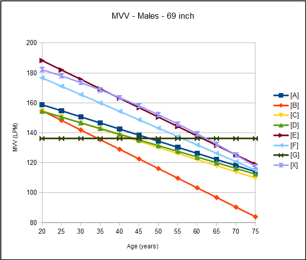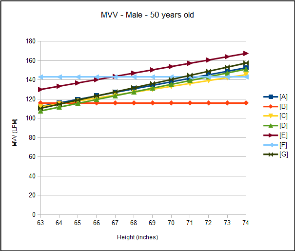 As usual there are always problems associated with selecting a specific reference equation. Several of the reference equations, particularly those for females, are quite limited because only a single factor, either age or height, is used to calculate the predicted MVV and for this reason these reference equations should be avoided. Most of the studies have a limited population size with a limited range of ethnicities. This makes it unclear what effect, if any, ethnicity has on predicted MVV.