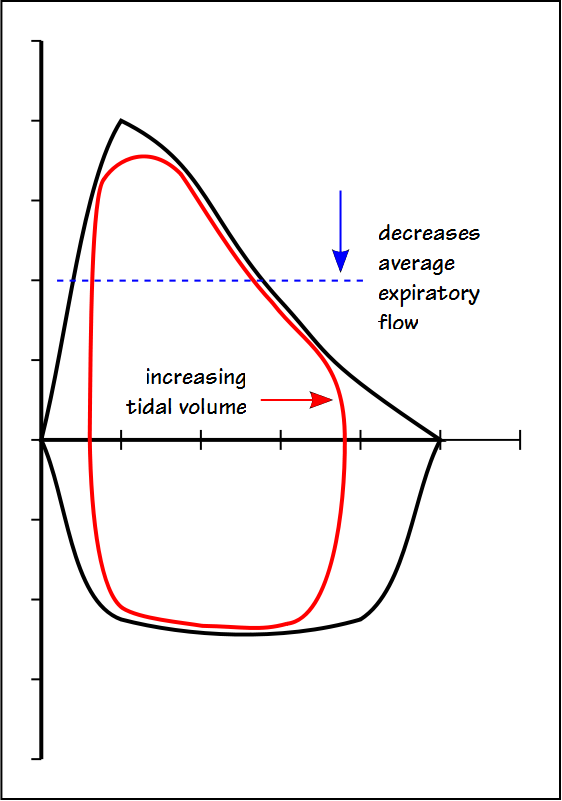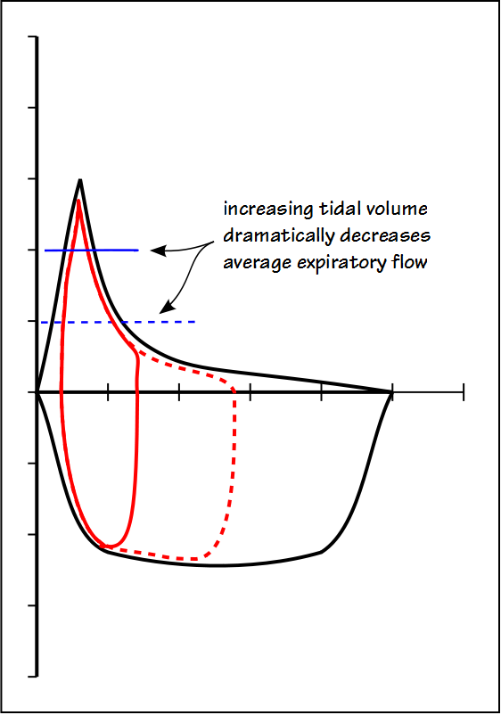 In individuals with normal lungs, there is still a fairly broad range of lung volumes where the average expiratory flow rate is relatively high. When obstructive disease is present however, there is only a narrow range of lung volumes where high expiratory flow rates are possible and any attempt to increase tidal volume will dramatically decrease the average expiratory flow rate.
