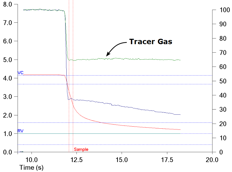 Finally, the CH4 concentration near the end of exhalation is used to calculate the VEE and this assumes that the tracer gas concentration is homogeneously distributed through this volume. The CH4 curve from a patient with COPD however, shows a steady decrease in tracer gas throughout exhalation and if this is extrapolated it implies that the CH4 concentration within the VEE is less than that it is at end-exhalation. This in turn implies that under these circumstances the VEE is being underestimated.