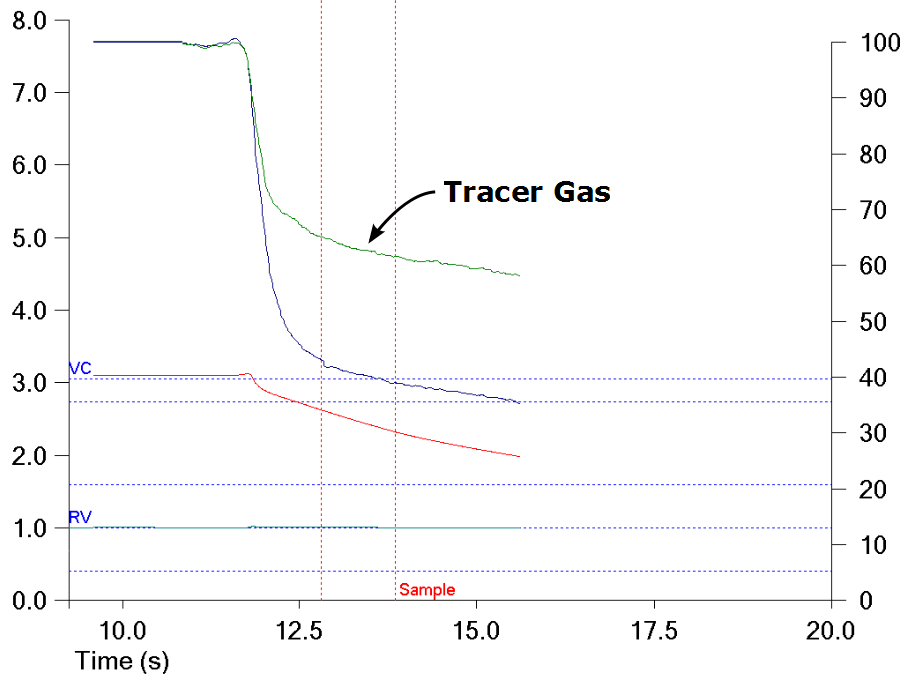 For these individuals there will likely be little difference in the VA measured by alveolar sample concentrations and the VA measured by mass balance. In individuals with airway obstruction there is often a significant level of ventilation inhomogeneity. When this occurs it is usually seen as a sloping tracer gas line.