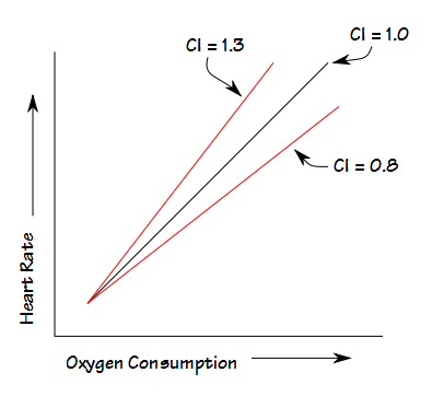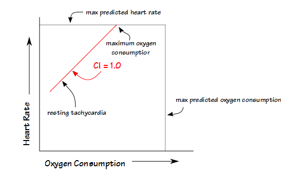 For almost everyone there is a linear relationship between heart rate and oxygen consumption. When you plot them against each other you can put a ruler on the plotted points and see that they form a straight line. Chronotropic Index and O2 pulse are two ways of analyzing this relationship.