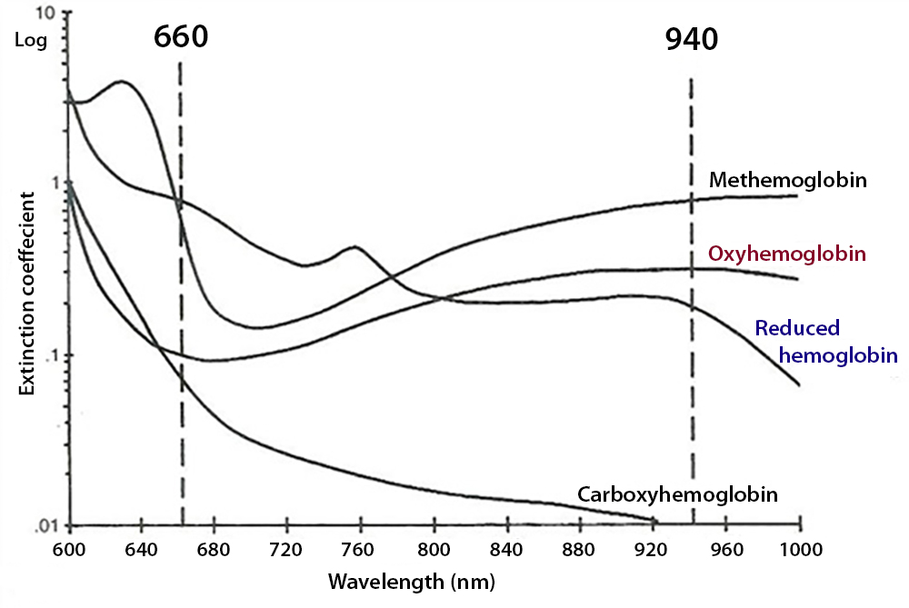 Although the mathematics are more complex than this, it is primarily the ratio of light absorbed at 660 nm (red) to that at 940 nm that in turn is used to perform a look-up from a table of empirically derived values in order to calculate SaO2.