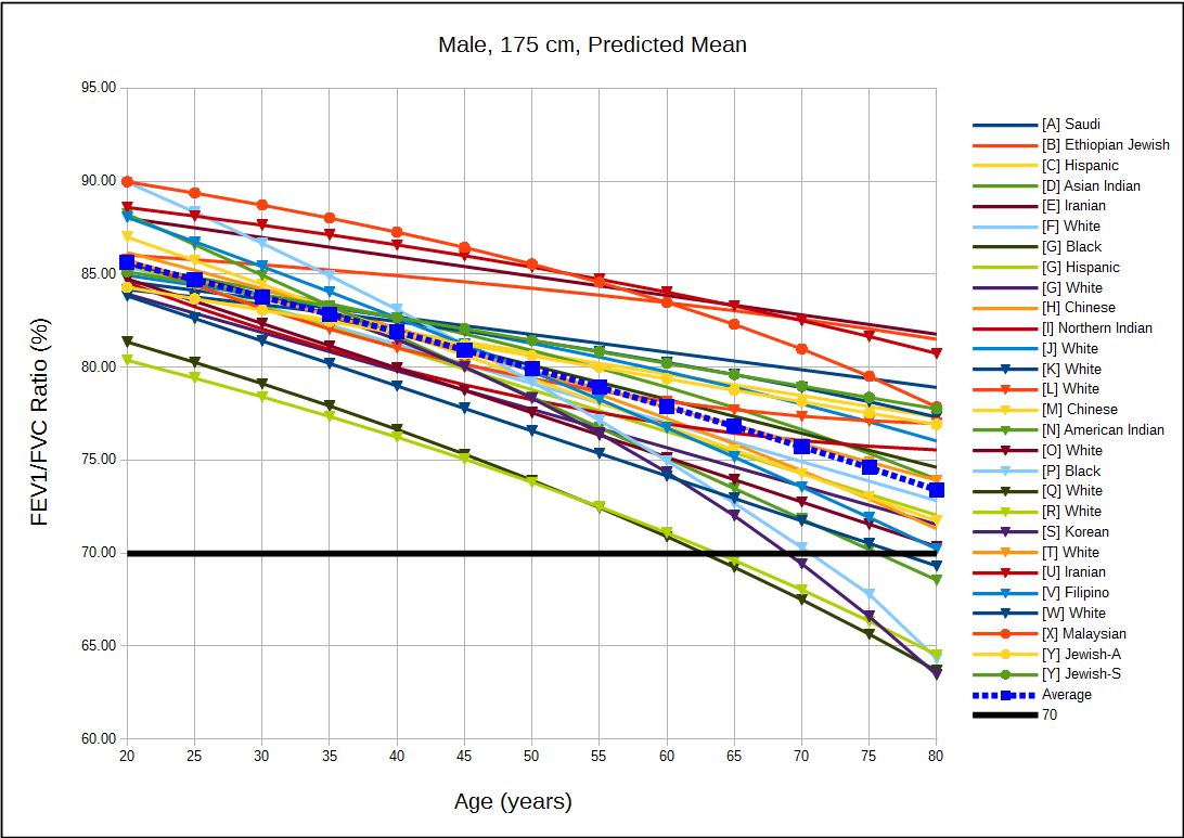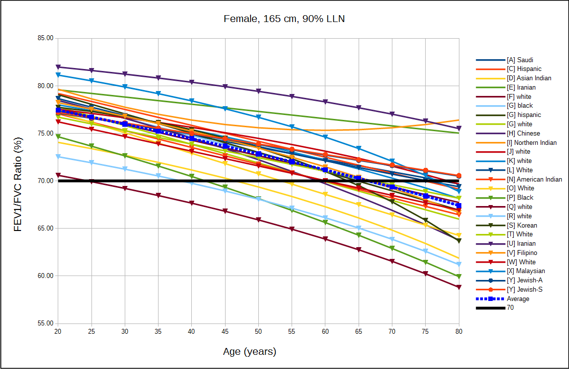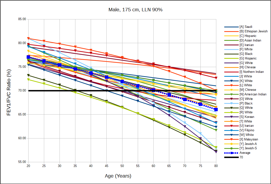 When this is done, the limitation of the 70% ratio in relation to increased age becomes more obvious, particularly since the average of all LLN’s (for males) reaches 70% at age 65. This means that approximately half of the reference equation LLN’s show a decrease below 70% before that age, and some as young as age 33. Theoretically at least, using the GOLD criteria by age 65 up to half of the world population could have spirometry that was potentially within normal limits but would be considered to have COPD.