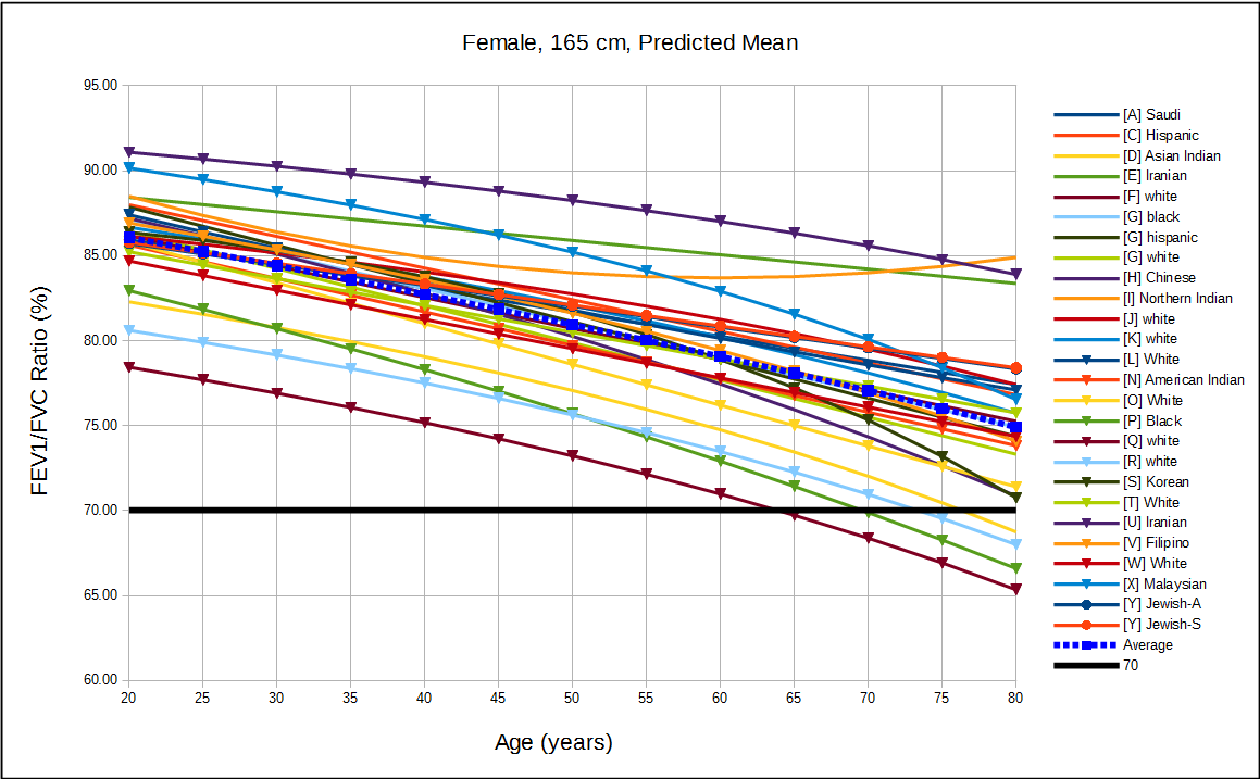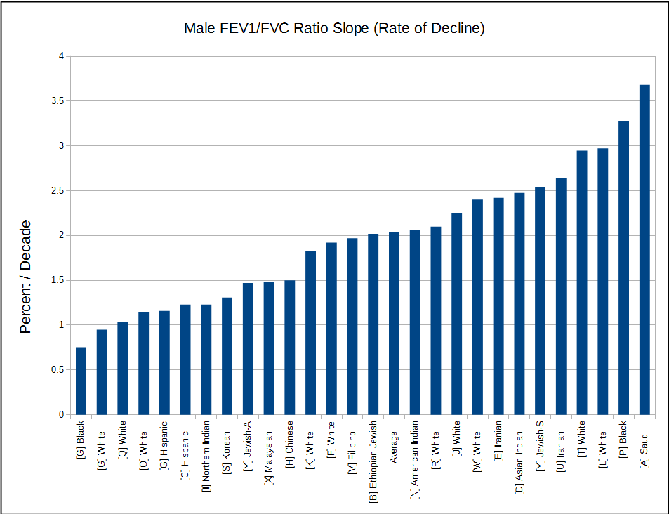Looking closely I am unable to see any particular relationship between ethnicity or geographical location and the FEV1/FVC ratio. This fact is highlighted by the slope (rate of decline) of the FEV1/FVC ratios with age.