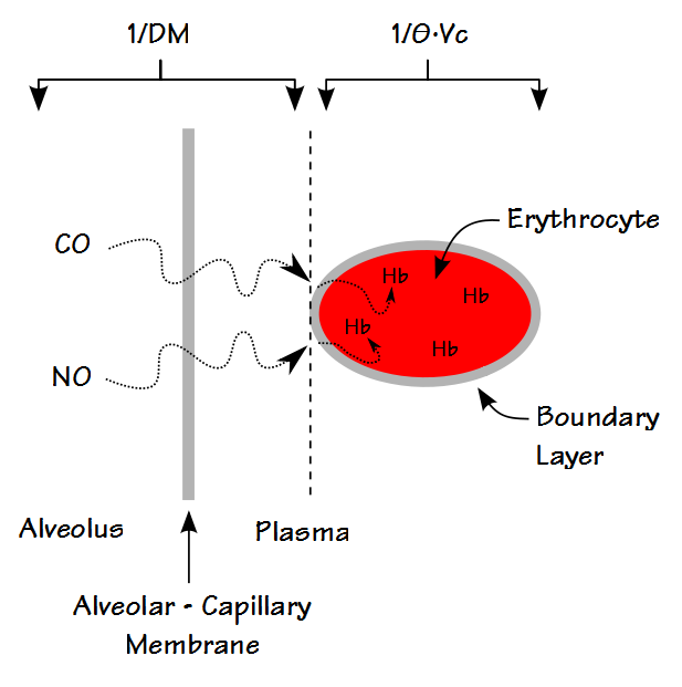 The first resistance (1/DMCO) is the resistance to the diffusion of CO through the alveolar-capillary membrane and blood plasma to the surface of the stagnant plasma boundary layer around a red blood cell. The second resistance refers to the diffusion rate of CO through the plasma boundary layer, then the wall and interior of the red blood cell and finally the rate of reaction with hemoglobin.