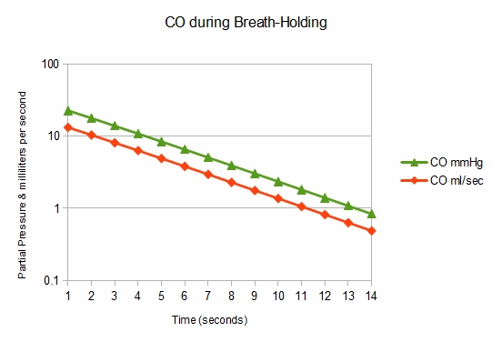 Now, let’s look into what the Krogh constant describes. During breath-holding, CO does not disappear from the lung linearly but in an exponential decay curve. This is because as CO leaves the lung the driving pressure (partial pressure across the alveolar membrane) of CO decreases.