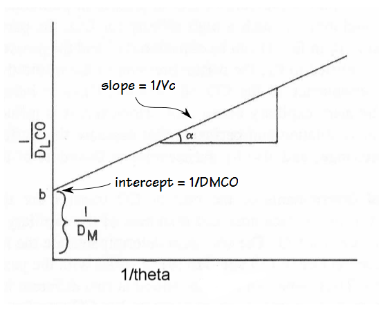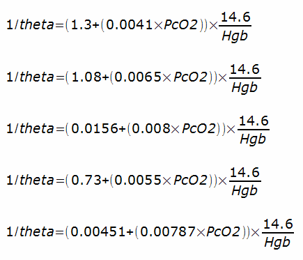 From the formula it can be seen that DMCO and Vc depend on how theta is calculated. Theta (or more specifically 1/theta) is the rate of CO uptake by red blood cells. The original and most commonly used formula for calculating 1/theta was:
