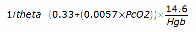 Because carbon monoxide and oxygen both compete for sites on the hemoglobin molecule a second critical factor is that 1/theta (and DLCO) will therefore vary with the O2 concentration. The pulmonary capillary O2 concentration cannot be measured directly however, and must be estimated. There are several different approaches for doing this. The simplest is to subtract a constant (usually 10) from the alveolar PO2 (although I’ve seen that at least one researcher added 5 to PAO2 instead) to derive PcO2. A more rigorous approach is to calculate PcO2 from:
