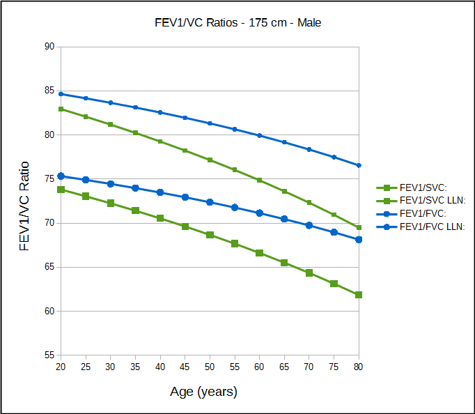 Because the SVC is usually larger than the FVC, the FEV1/SVC ratio will usually be lower than the FEV1/FVC ratio. Although Marsh et al derived a reference equation specifically for the FEV1/FVC ratio they did not do the same for the FEV1/SVC ratio. For this reason, I’ve calculated a predicted FEV1/FVC ratio from the individual reference equations for FVC and FEV1, and then a predicted FEV1/SVC ratio from the individual reference for SVC and FEV1 (this may well be mis-using the reference equations but I’m trying to show comparable values). For an LLN I’ve used the LLN from the NHANES III reference equations, which is approximately 89%.