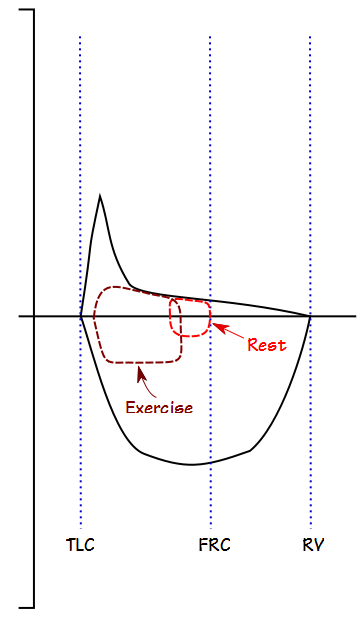 Even when maximum exercise has been attained however, flow rates tend to remain well within the maximal flow-volume loop envelope. and ventilation tends to remain around FRC.