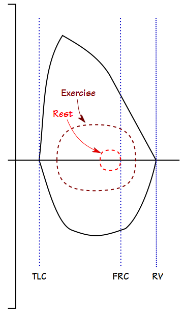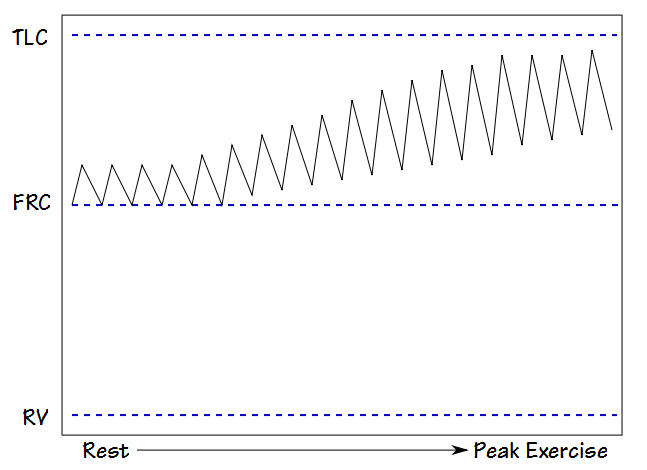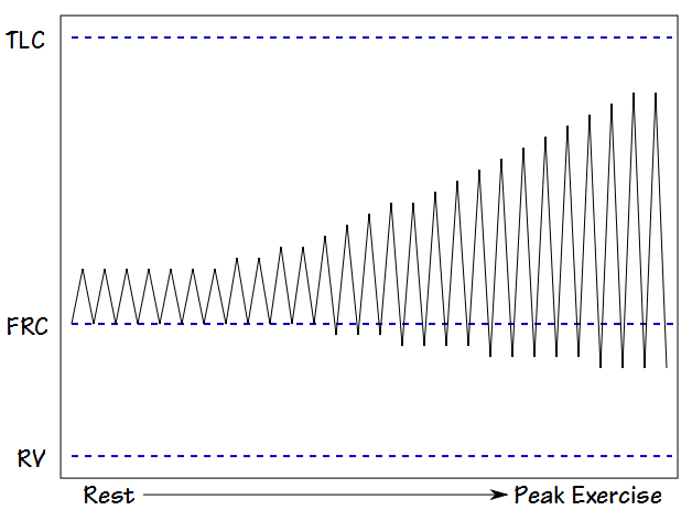 Note: The end-exhalation volume during exercise in individuals with normal lung function often decreases below the resting FRC. Although this requires an additional expiratory effort, the elasticity of the rib cage and deformation of the abdominal wall causes this energy to be recovered during inhalation which allows tidal volume to increase with little increase in energy expenditure.