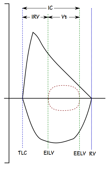 If lung volumes are measured prior to exercise, then the End-Inspiratory Lung Volume/Total Lung Capacity ratio (EILV/TLC) can also be calculated. EILV is calculated from Vt and EELV as: