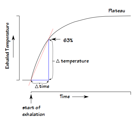 One of the early group of researchers noted that exhaled air temperature increased exponentially during exhalation. For mathematical reasons, they determined that the temperature slope from the beginning of exhalation to 63% of the plateau temperature best characterized the rate of increase. In this and related studies exhalation was standardized with a mouth pressure of 10 cm H2O and at a flow rate of 10-11 LPM and results were expressed as degrees centigrade per second.