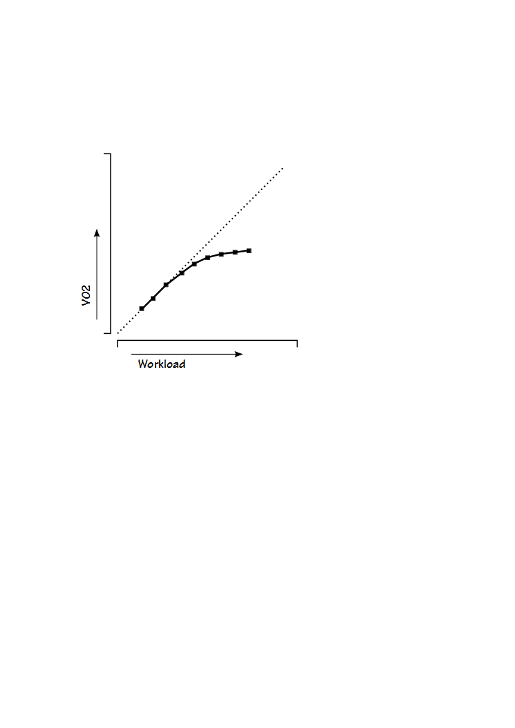 Finally for individuals with normal cardiovascular function, there is a linear relationship between VO2 and workload. For individuals with a low cardiac output, a significant proportion of their energy, particularly above anaerobic threshold comes from anaerobic processes. This means that VO2 decreases more slowly for a given increase in workload.