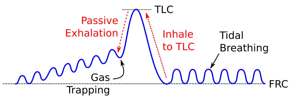 But you don’t necessarily need lung volume measurements to determine the presence of gas trapping. Back in the 1970’s and 1980’s when we had water-seal volume displacement spirometers with a kymograph there was a relatively simple test to detect gas trapping. Specifically, we’d have a patient start with tidal breathing and then have them take a deep breath in and then ask them to return to normal breathing. Patients without gas trapping would have the end-exhalation level of their tidal breathing return to FRC almost immediately, while those with gas trapping would take a number of breaths before this happened. This test wasn’t particularly qualitative but it clearly differentiated between patients with gas trapping and those without.
