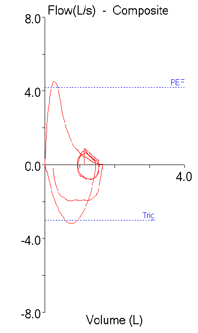 With this in mind, I see up to a dozen reports a week with restrictive-looking spirometry (i.e. symmetrically reduced FVC and FEV1 with a normal FEV1/FVC ratio) on patients with a diagnosis of asthma. This is nothing new and there have probably been at least 10 articles in the last decade about the Restrictive Spirometry Pattern (RSP). Interpreting these kinds of spirometry results is always problematic, particularly when there are no prior lung volume measurements to rule-in or rule-out restriction. I’ve noticed however, that patients with a restrictive spirometry pattern almost always have the tidal loop on the far right-hand side of the flow-volume loop (zero or near zero ERV). For example: