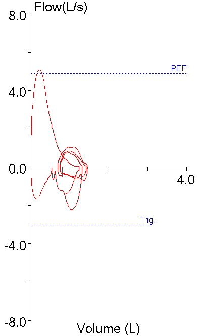 I’d be the first to admit that this flow-volume loop could be the result of the patient leaking around the mouthpiece. I’d even argue that expiratory leaks are more likely to occur than inspiratory leaks and that this could explain why the end of expiration is to the left of the beginning of the inspiration (i.e. FIVC > FVC). However, after reviewing a number of RSP loops I saw that this was occurring in somewhere around a quarter of them and that seems to be a bit too many to attribute to leaking, particularly since the same thing doesn’t seem to be happening in patients with restriction.