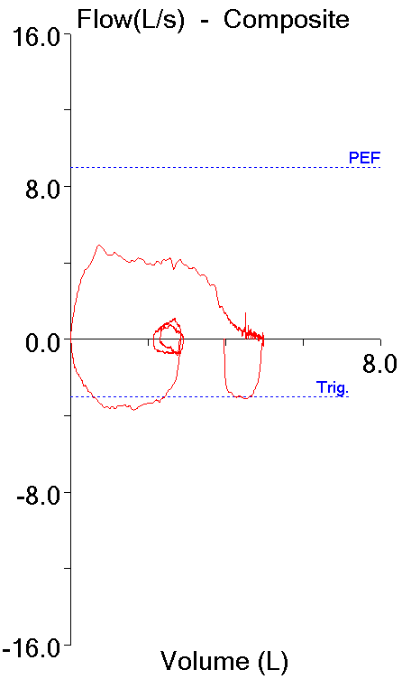 The Cardio-Thoracic Surgery division of my hospital has an active tracheal reconstruction and stenting program. For this reason we see a fair number of patients with tracheomalacia. Tracheomalacia occurs for a wide variety of reasons and can be congenital or caused by intubation or it can be secondary to cystic fibrosis, relapsing polychondritis, emphysema and a number of other lung diseases. What it basically means is that the trachea has lost some or all of its rigid cartilagenous support and has become floppy and easily collapsible. When a patient with tracheomalacia performs a Forced Vital Capacity, the trachea collapses and limits expiratory flow. This is shown by the plateau on the flow-volume loop.