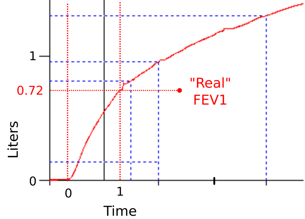 If the “real” start of exhalation was used instead, the FEV1 changes from 0.96 L (37% of predicted) to 0.72 L (28% of predicted), and although that’s a relatively small difference it changes the interpreted severity of the patient’s airway obstruction from “severe” to “very severe”.