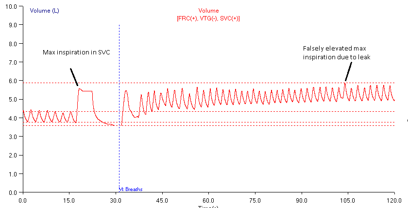 The procedure for plethysmography is for the patient to breath tidally for a period. This period is used to determine the volume level of the patient’s FRC. At end-exhalation a shutter interrupter closes (optimally at FRC) and the patient pants for a short period of time. While the shutter is closed the patient’s mouth pressure and the plethysmograph’s box pressure are measured and used to compute thoracic gas volume (TGV). When the shutter opens, the patient resumes tidal breathing and then performs a slow vital capacity maneuver. When the computer analyzes this test, it fails to recognize that the patient leaked while the shutter was closed which in turn caused the volume baseline for the SVC test to shift upwards. This causes the Inspiratory Capacity (IC) to be overestimated and since TLC = FRC+IC and RV = TLC – SVC, both TLC and RV are overestimated.