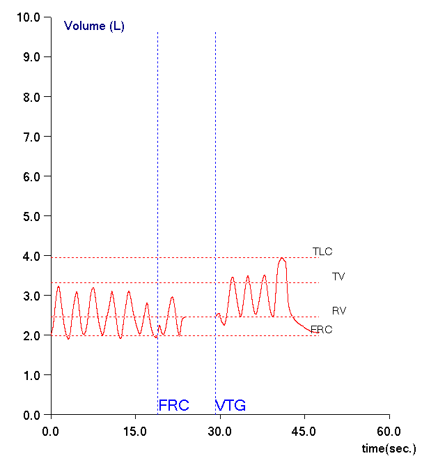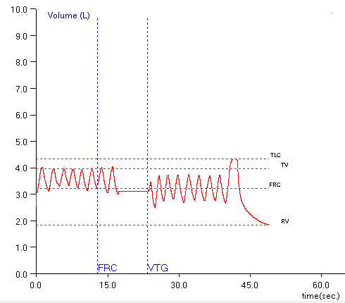 When lung volumes are measured in a plethysmograph the actual measurement is called the Thoracic Gas Volume (TGV). This is the volume of air in the lung at the time the shutter closes and the subject performs a panting maneuver. Ideally, the TGV measurement should be made at end-exhalation and should be approximately equal to the Functional Residual Capacity (FRC). For any number of reasons in both manual and automated systems this doesn’t happen and the point at which the TGV is measured is either above or below the FRC.