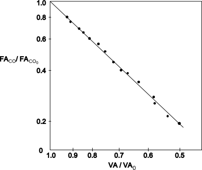 The slope of the relationship of ln FACO/FACO0 vs ln VA/VA0 is analyzed through least squares regression analysis and uses data from the beginning of dead space washout to closing volume.