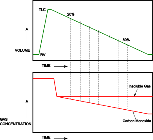 During exhalation, once the gas that exits the lung leaves the alveoli, diffusion ceases. Gas that exits the lung during the early part of exhalation will have had less time for CO to diffuse from the alveoli into the pulmonary capillaries and will have a higher concentration of carbon monoxide than will gas that exits later. Exhaled gas can therefore be considered to consist of a continuous set of alveolar gas samples, separated by time and the differences between these “samples” can be used to calculate DLCO.