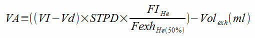 Additionally, alveolar volume (VA) remains a significant component of the DLCOexh calculation and how this is derived differs between specific DLCOexh techniques. When the method used to calculate VA was reported investigators measured either the methane or helium gas concentration at 50% of the exhaled vital capacity [11][12], or from the methane or helium gas concentration at the beginning of exhalation [13][7][2] whereas other studies [5][4] only stated that expired methane was used to calculate VA without saying whether this value was obtained at the beginning or middle of exhalation, or was a mixed-expired value.