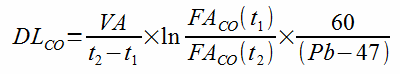 An alternate approach first proposed by Martonen and Wilson [8], the natural logarithm of exhaled carbon monoxide and of alveolar volume are used to calculate DLCOexh. After exhaling to RV, subjects inhale the DLCO gas mixture to TLC. After breath-holding for approximately 1 to 2 seconds, the subjects exhale slowly at a constant rate (0.3 to 0.6 L/sec). Gas concentrations measured between 20% and 80% of the exhaled volume are used to calculate DLCOexh as follows: