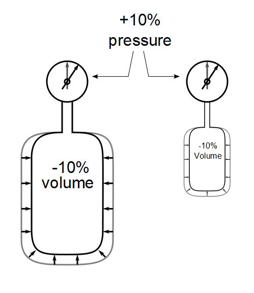 This means that in a closed system, there is a proportional relationship between pressure and volume. Decrease the volume and the pressure increases proportionally. Increase volume and the pressure decreases proportionally as well. This effect is independent of the size of the system, so both large and small systems will act in the same way.