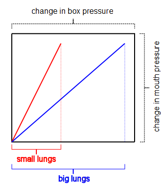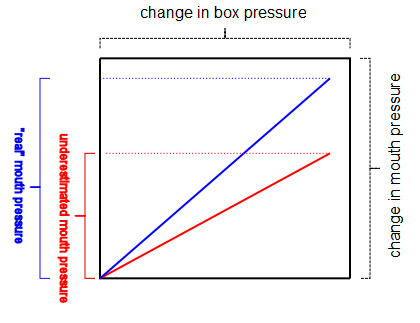 Mouth pressure and box pressure are simultaneously plotted against each other and it is the slope of this vector tracing the shows lung volume. Assuming that the same amount of pressure is used to expand or compress the lungs (and humans, regardless of size, tend to generate the same pressures) a small lung will cause a small change in box pressure and therefore a steep pressure tracing. A large lung will cause a large change in box pressure and a shallow pressure tracing. The slope of the tracing is therefore directly related to the volume of the lung.
