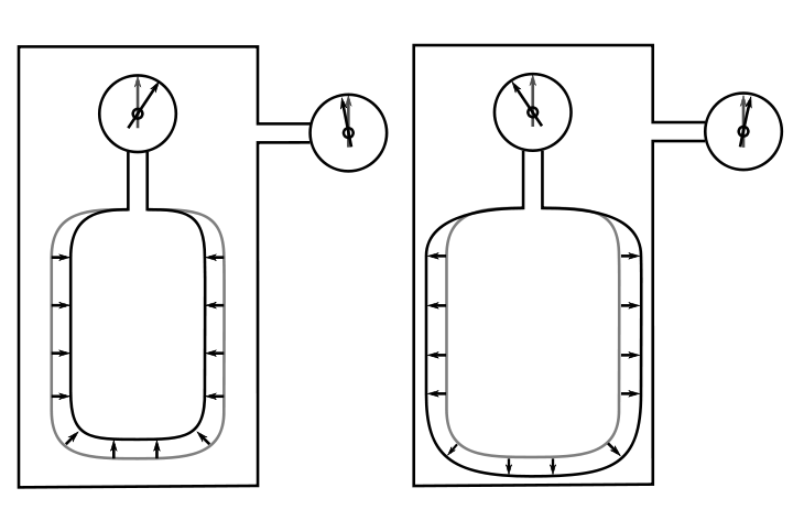 To measure lung volume, lungs (the person is optional) are placed inside of a pressure-tight box (the plethysmograph). When the patient inhales and exhales against a closed shutter the lungs expand and compress and mouth pressure decreases and increases accordingly. This maneuvercompresses and rarifies the air in the box and the pressure in the box increases and decreases.