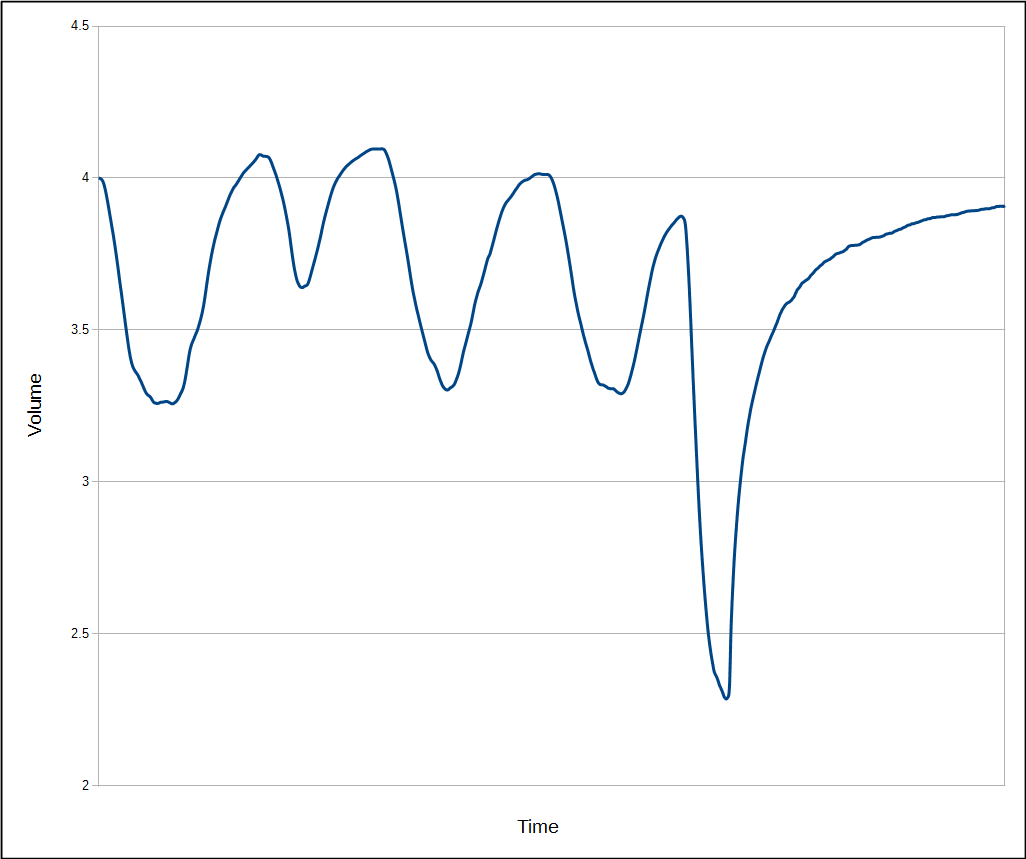 There is also nothing in the ATS/ERS spirometry standards that specifically addresses tidal loops. To a large extent I can understand this since the standards are primarily designed to address the actual FVC, SVC and MVV test maneuvers. Even so, the standards include several graphs that show the tidal breathing prior to the maneuver and it is evident that it is assumed to be stable and not drifting in any way. For this reason I think that the next time the ATS/ERS spirometry standards are updated it wouldn’t hurt to define the acceptable limits on any drift during tidal breathing.