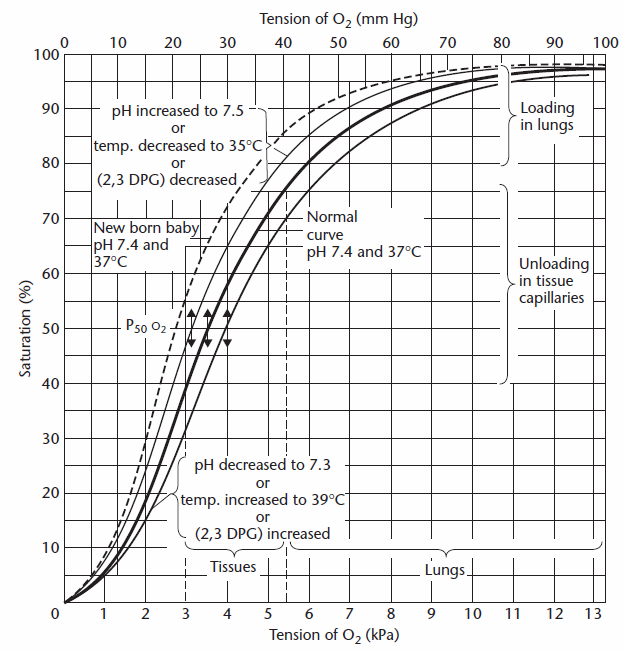 Note: Interestingly neither the oxygen dissociation curve nor Severinghaus’s formula take carboxyhemoglobin (or methemoglobin) into account. For that matter, this issue has not been included in any of the textbook discussions of shunt fraction I’ve read. COHb skews the relationship between PO2 and SO2 (downwards if you’re working from PO2 to SO2, upwards if you’re working from SO2 to PO2). Normal COHb levels in non-smokers are 1-2 and this amount of COHb is unlikely to make a significant difference in the shunt fraction calculations. In the absence of any firm guidelines however, when higher levels of COHb are present they should probably be used to adjust Cc’O2 accordingly.