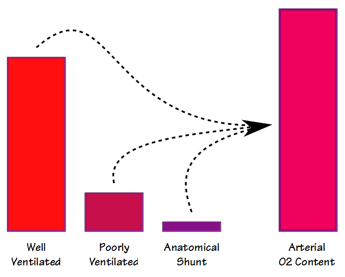By having a patient breath 100% O2 until the nitrogen has been washed out of their lung (nominally 20 minutes), the oxygen concentration in even poorly ventilated units will approach 100%. This means that the partial pressure and saturation of blood leaving both the poorly and the well ventilated alveolar units will be the same. For this reason, any decrease in the arterial oxygen content will be due solely to an anatomical shunt.