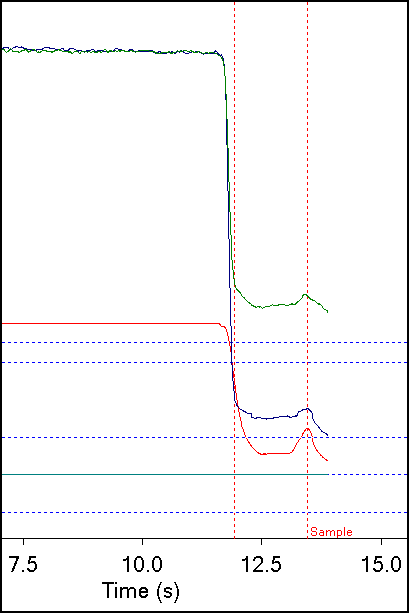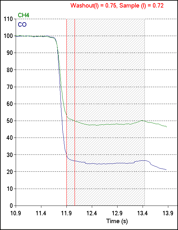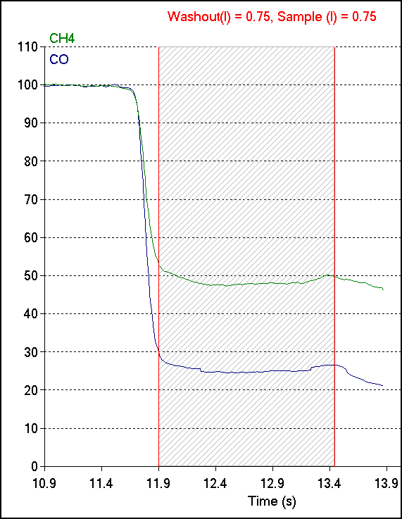Most test systems display the alveolor sample as a exhaled CH4 and CO concentrations versus time, and there is nothing particularly unusual about this graph. When the exhaled volume is added however, the alveolar sample error is immediately evident: