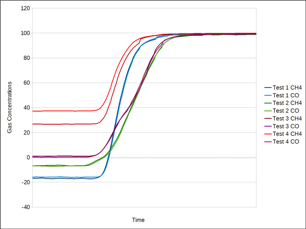 This graph showed that the baseline CH4 and CO readings were significantly elevated, but this hadn’t been evident in the previous tests.