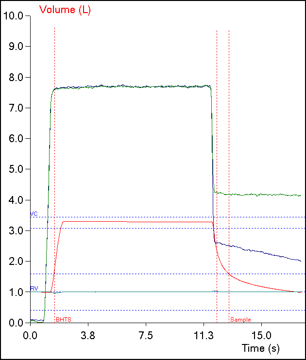 The 2017 DLCO standards now requires that the alveolar sample period be displayed as gas concentrations versus volume, not gas concentrations versus time. Once our test systems are updated to meet the new standards problems determining alveolar volume will be a lot more self-evident. Since the 2017 standards requires that graphs of the full DLCO maneuver (and the alveolar sample) are included on reports verifying the accuracy of the BHT shouldn’t be that difficult.