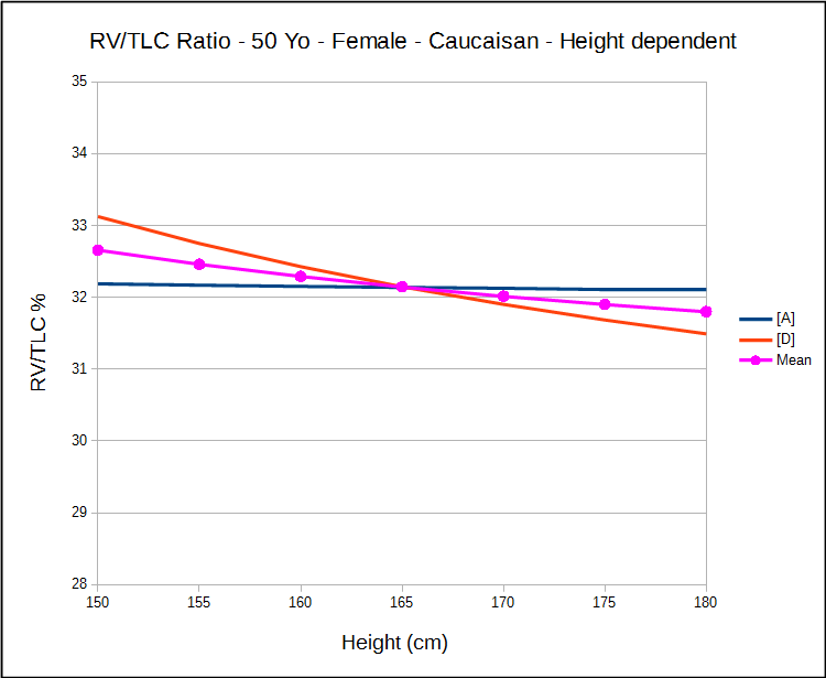 At the time the book was written age was the only variable in all of the RV/TLC reference equations but since 1987 at least two lung volume studies have been published that do not have reference equation specifically for the RV/TLC ratio. Instead it was calculated from the reference equations for RV and TLC and these included height in one way or another as a variable. Although the differences are less dramatic for females than for males, both studies show that the RV/TLC ratio actually decreases with increasing height.
