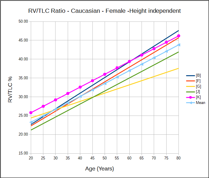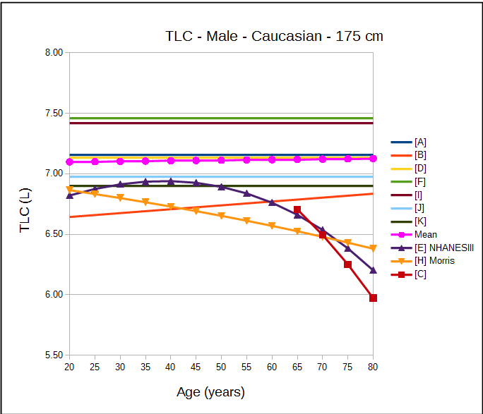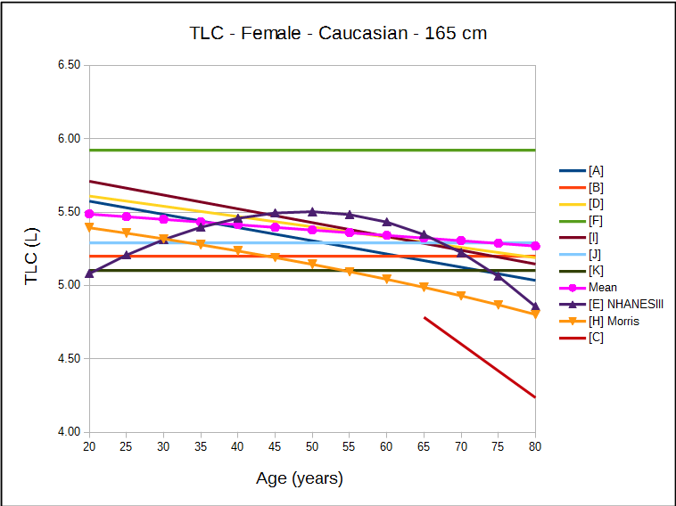 An interesting question that the FVC-derived TLC raises is whether the fact that TLC changes little with age (mostly for males, partly for females) is actually correct. All FVC-derived TLCs decrease with increasing age (at least above age 50 they do). As noted, this may be a function of the different age slopes for FVC and RV/TLC, but if so why does this difference exist?