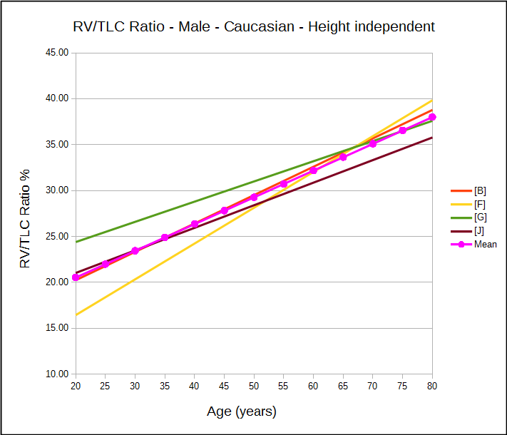 Technical note: The average of the height-independent RV/TLC ratio reference equations for males is: