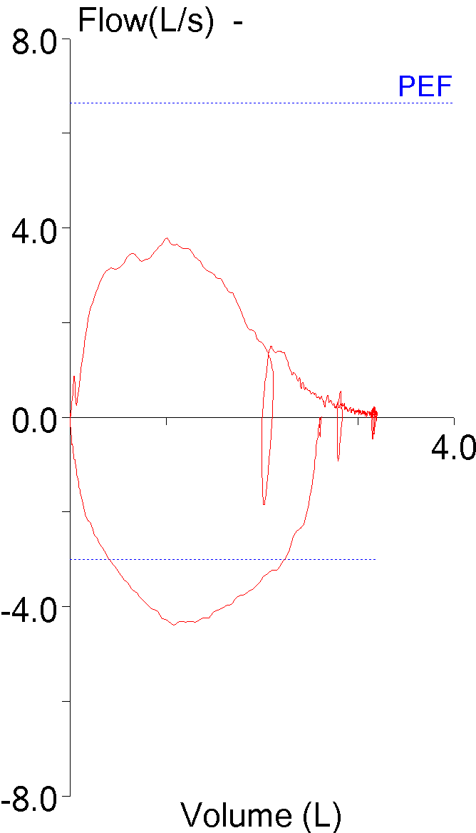 In this instance the inspiratory capacity was almost nonexistent. Inspiratory capacity can be reduced in severe COPD due to expiratory flow limitation and gas trapping but in this case the tidal loop doesn’t show this and the small IC is more likely due to a submaximal effort.