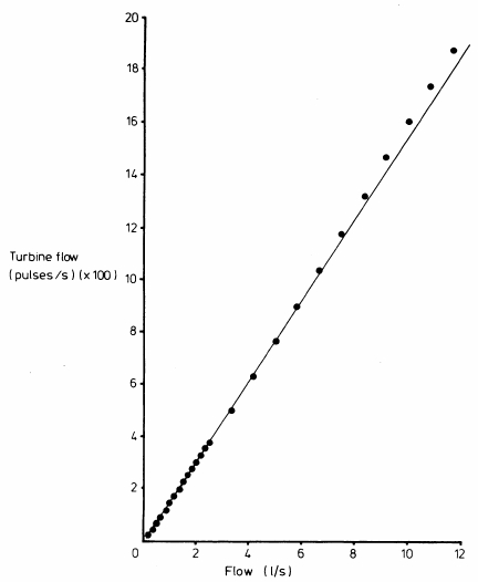 One interesting point is that most turbine spirometers produce one “pulse” for every half-rotation and that each rotation is related to a specific volume of gas. At high flow rates, the pulse count rate is also high. One manufacturer indicated that their device had 144 pulses per liter (which works out to 6.9 ml/pulse). The current ATS/ERS recommendation is that spirometers should have a sampling rate of 100 hz. Even at modest flow rates (> 0.69 L/sec), the number of pulses/second is above 100 hz, but at lower flow rates the pulse count rate drops below 100 hz. At terminal flow rates (0.025 L/sec) the pulse count rate is only 3.6 hz. To some extent this means that turbine flow meters do not meet ATS/ERS standards but in reality it is a reflection of how they operate.