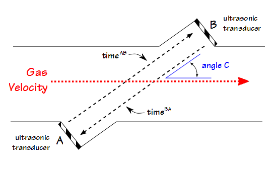 The transit time of an ultrasonic pulse depends on the distance between the two transducers, the angle of the pulses relative to the direction of gas flow, and the speed of sound. When gas is flowing as shown in the diagram, the transit time from transducer A to transducer B is: