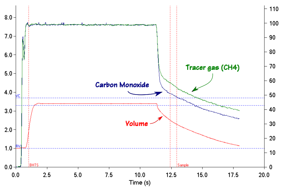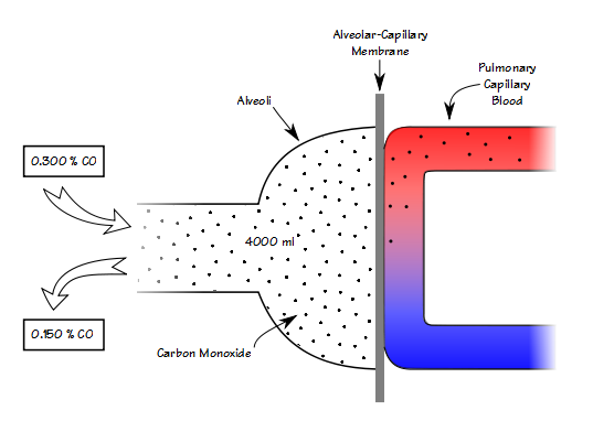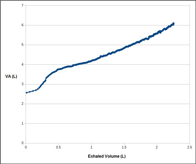 It is important to remember that the VA is measured from an expiratory sample that is optimized for measuring DLCO, not VA. When an individual with significant ventilation inhomogeneity exhales, the tracer gas (and carbon monoxide) concentrations are highest at the beginning of the alveolar plateau and decrease throughout the remaining exhalation.