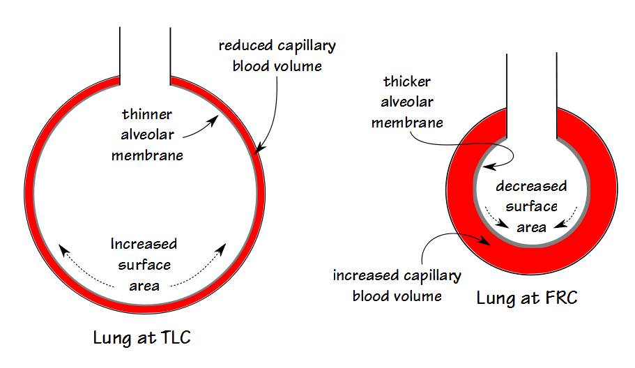 The lung reaches its maximum surface area near TLC, and this is also when DLCO is at its maximum. At this time the alveolar membrane is stretched and at its thinnest which reduces the resistance to the transport of gases across the membrane. Simultaneously however, the pulmonary capillaries are also stretched and narrowed and the pulmonary capillary blood volume is at its lowest.